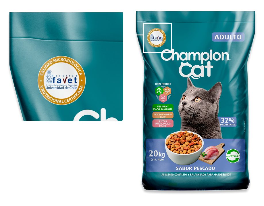 Revisa en el costado superior izquierdo de tu alimento seco Champion Cat y encontrarás la certificación Favet.